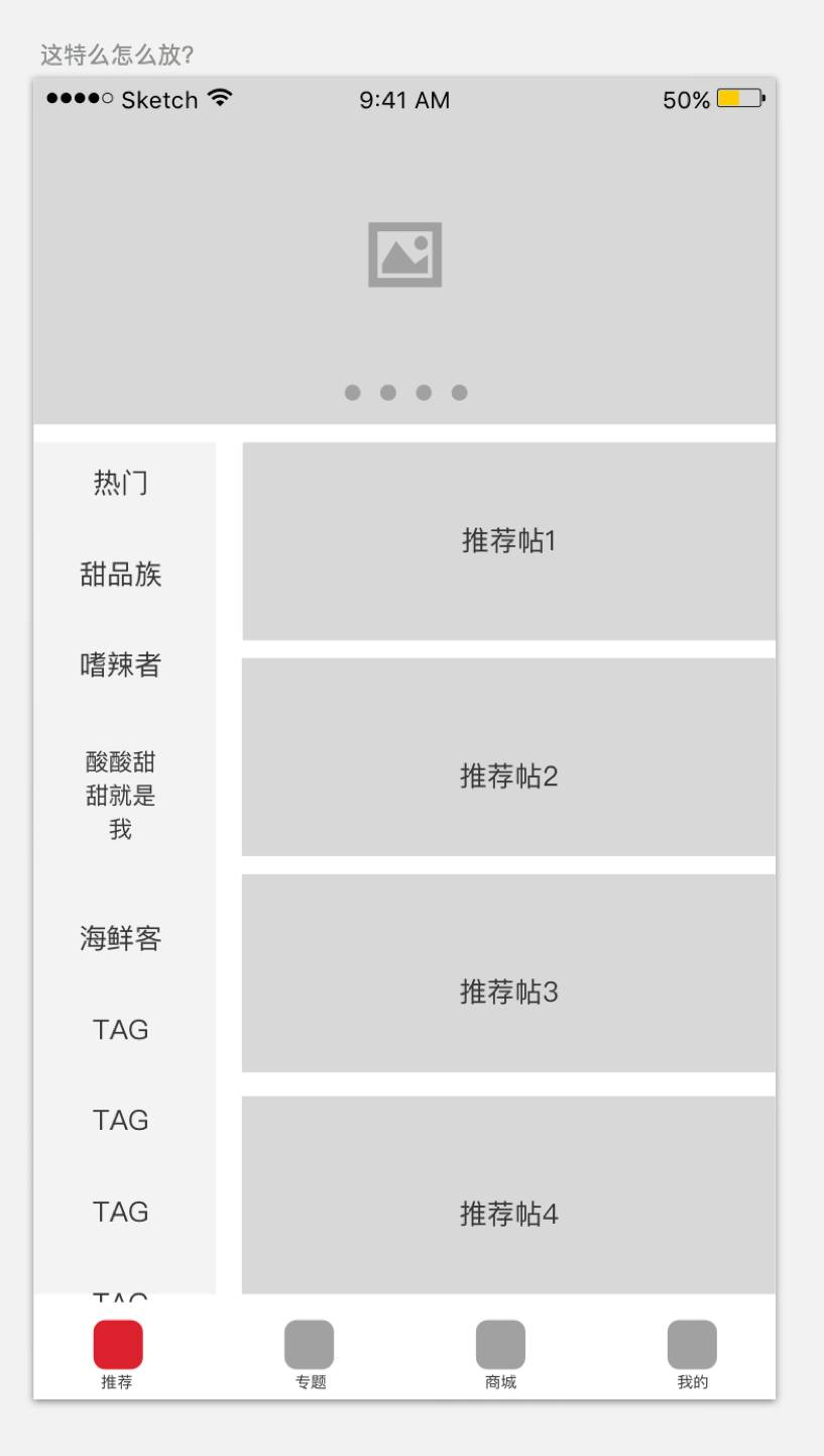 第二,由于右边的tag占据了推荐贴的位置,导致推荐贴可能没有左边的那种展现形式更加醒目。但是相对的,图右的优势在于,由于竖向排列tag可以让一个屏幕显示更多的tag,这一点就需要取舍,比如一个产品的初期没准备放这么多切换tag的话,还是建议用左边那种。