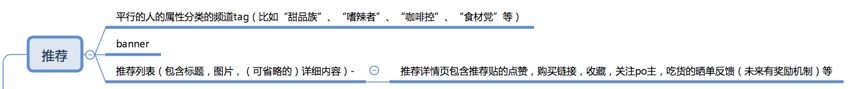 大家明白了么,所谓app“内容”的产生,就是我上述这些奇怪东西的综合(当然其实并没有上述这么简单,这个以后有机会细讲),比如我们从上面的论述当中,我可以归纳出这款“什么值得吃”app的首页“推荐”应该具有的信息如下: