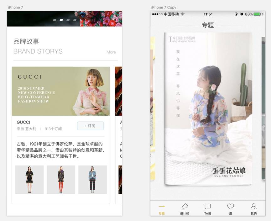 先看左面这个页面,虽然第二个品牌故事被遮挡了很多,但是由于我们看到了第一个GUCCI的之后,用户心理预期就有了,用户左滑一下屏幕大概率出现的也是这样形式的不同内容。