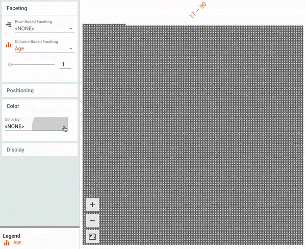 | Facets Dive 以可视化方式显示 UCI 人口普查测试数据集[1]中全部的 16281 个数据点。此动画向用户显示对各数据点进行着色,每个颜色代表一个特性(“关系”),通过一个连续特性(“年龄”)划分某个维度,然后,通过一个离散特性(“婚姻状况”)划分另一维度。 |