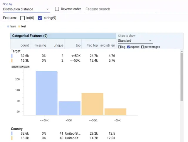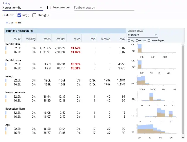 Facets Overview 自动帮助用户快速理解其数据集特性的值分布。可在同一个可视化视图中比较多个数据集(如训练集和测试集)。妨碍机器学习的常见数据问题被推到前端,例如,异常的特性值、缺失值比例很高的特性、分布不均的特性,以及数据集之间偏态分布的特性。