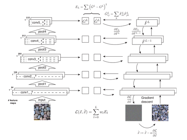 有了这么多铺垫,一切的要素已经凑齐,前置科技树也都已经被点亮了,终于可以进入正题了。基于神经网络的图像风格迁移在2015年由Gatys et al. 在两篇论文中提出:Gatys et al., 2015a和Gatys et al., 2015b。我们先说第一篇。第一篇比起之前的纹理生成算法,创新点只有一个:它给了一种用深度学习来给纹理建模的方法。之前说到纹理生成的一个重要的假设是纹理能够通过局部统计模型来描述,而手动建模方法太麻烦。于是Gatys看了一眼隔壁的物体识别论文,发现VGG19说白了不就是一堆局部特征识别器嘛。他把事先训练好的网络拿过来一看,发现这些识别器还挺好用的。于是Gatys套了个Gramian matrix上去算了一下那些不同局部特征的相关性,把它变成了一个统计模型,于是就有了一个不用手工建模就能生成纹理的方法。