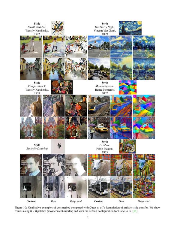 至此,我们就把关于基于神经网络的图像风格迁移(Neural Style)的重点解释清楚了。背后的每一步都是前人研究的结果,不用因为名字里带深度啊神经网络啊而感觉加了什么特技,特别的高级。Gatys所做的改进是把两个不同领域的研究成果有机的结合了起来,做出了令人惊艳的结果。其实最让我惊讶的是纹理竟然能够和人们心目中认识到的图片的风格在很大程度上相吻合。(和真正的艺术风格有很大区别,但是看上去挺好看的。。。)从那之后对neural style的改进也层出不穷,在这里就先放一些图,技术细节暂且不表。
