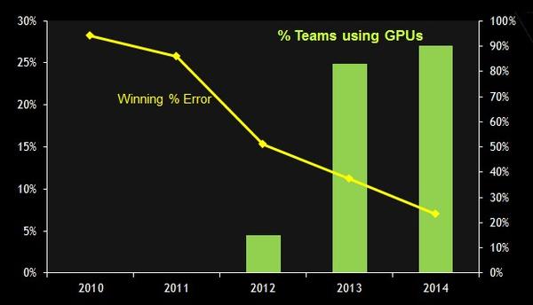 ImageNet物体识别比赛中使用GPU的队伍数量逐年上升,错误率逐年下降