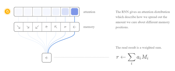 这类方法的关键在于将程序的行为可微分化。我们知道程序的行为是离散的,每一次指令都是读出或者写入一个存储(比如寄存器,内存等)。只有让离散的行为可微分化,才能利用 back propagation 去训练模型。NTM 巧妙的利用了 [attention][distll] 机制将 RNN 模型和外部的存储阵列连接起来。每次的输入和输出操作都连接到所有的地址,而每个连接都有一个权重(weight)来决定它的有效性。每次输出的结果可以看作是输入和权重的运算,而权重则可以通过网路训练得到。因此,计算机的离散行为就(通过 attention 机制等)转换成了连续的可微分化操作。沿着这类思路的工作还有 [3] 和 [2] 等。
