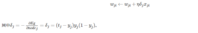 输出层的激活函数可以有很多种,这里用s函数,它的输出范围是0到1,通过训练让误差趋于0。所以更新公式为