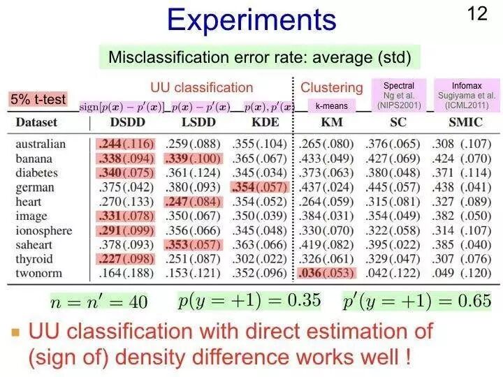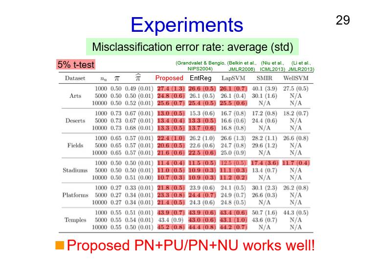 我们现在应该可以做一些类似平滑的正则化,这边其实并不好解释,也就是说可能在无标注数据当中获得标注数据。如果我们和其他的一些标准方法做一个比较的话,这样的一个PU加NU,PN加PU的方法所取得结果是非常好的。