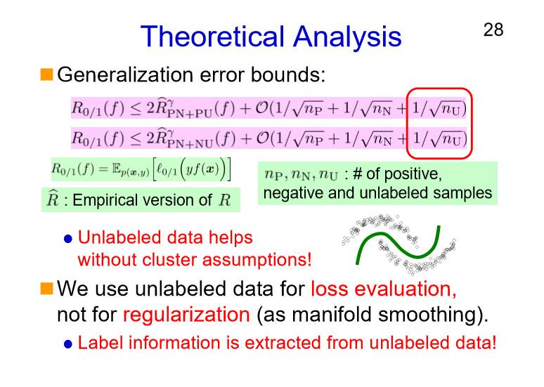 我们再来看一下泛化误差边界:所有的数据和类型其实已经看到了,最后NU一个错误率这边还是存在的。换句话说,如果我们能够使用未标注的数据,哪怕没有簇假设(一个聚类簇对应一个标注类别)也能够控制泛化误差在一定合理的范围之内。一开始我们无标注的数据只是对它进行一个传播,但是这样的一些无标注数据,更多只是用于这样的损失和评估,而并不适用于正则化。