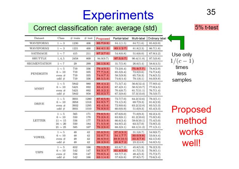 随后我们做了相应的实验,我们所提出的方法在这里,部分标签数据互补数据都在这边用,我们只会使用1除以(c-1),如果我们有10类,如果你说不是1类,可能正常样本是第10类,换句话说最起码有9个互补标签,不是两个三个四个,需要C减1,10减1,需要9个互补标签。我们的方法应该算是最好的,就算是和右手边最常见、最主流的方法来比,我们做的更加的好,以上就是我们的实验结果。