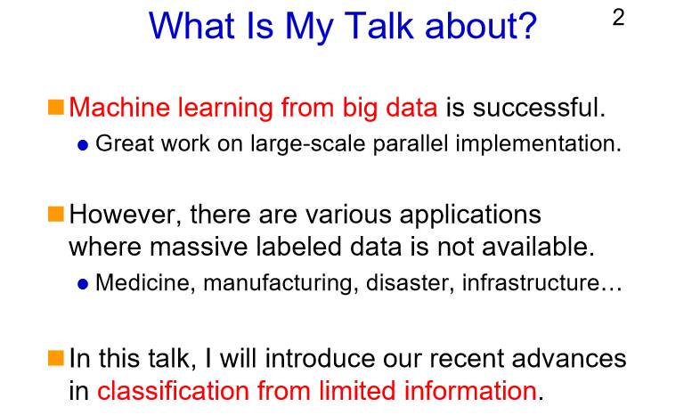 昨天漆远谈到了金融领域的机器学习,从大数据的角度来看,它是机器学习很重要的研究领域,并且目前还是非常的成功,我也一直对基于大数据来做机器学习这件事情非常感兴趣。然而,现在对于很多的应用领域而言是无法获取大规模的标注数据的,比如医药、制造业、防灾等领域。当数据量不够时,我们需要相应的机器学习方法来应对。