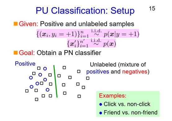 我们有两类数据样本,一种是属于正类的,另外一类是未标注的。当然未标注的数据里包含了正类和负类两种数据,但是我们并不知道其中哪些是正类,哪些是负类。对应这种数据类型的一个例子是,比如有一些你点击和未点击的网站,对于那些未点击的网站中,你既有未来可能会点击的,也会有你不会点击的(或者有想点击的,但可能由于忙而没有真正点击的),对这些网站点击数据,我们可以应用PU的分类方法。