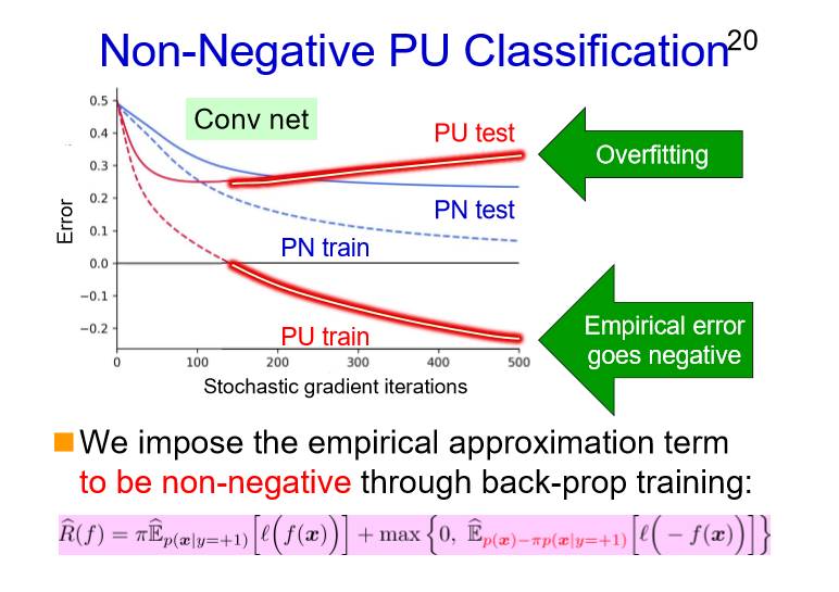 我们再来看一下之前的PN的风险函数公式,就是基于P数据和N数据的风险对U数据的分类风险进行估计。根据这个定义,N数据的风险是非负类的,但是它是PU的样本,在现实当中我们要对样本进行估计。所以说PU可能是会为负的,因为这个是会有一个负号,通常是应该是负号的,但有可能这个差会是负的,特别是对于可扩展性较高的模型来说,比如说像深度网络是会出现这个情况。