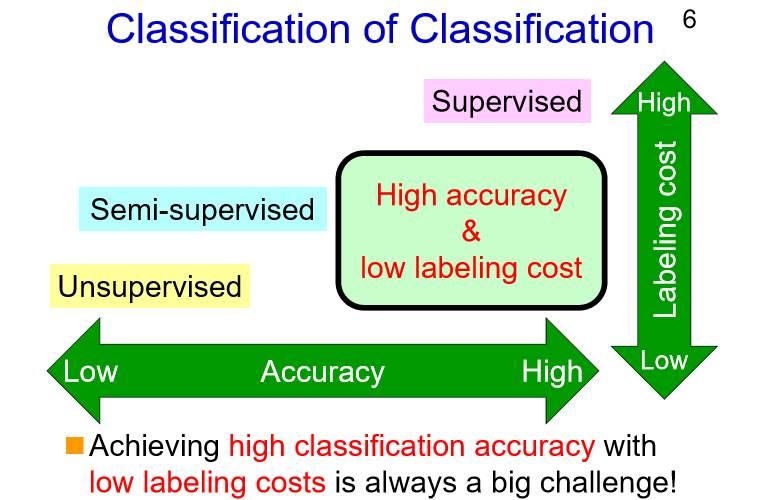 对于不同类型的分类方法,标注的成本有高有低,所取得的分类准确率也有高有低。对于监督分类,能够取得很高的分类准确率但同时标注的成本非常高;而对于半监督和非监督分类,标注的成本都比较低(甚至没有),但取得的分类准确率并不高。