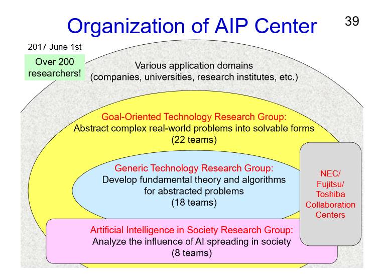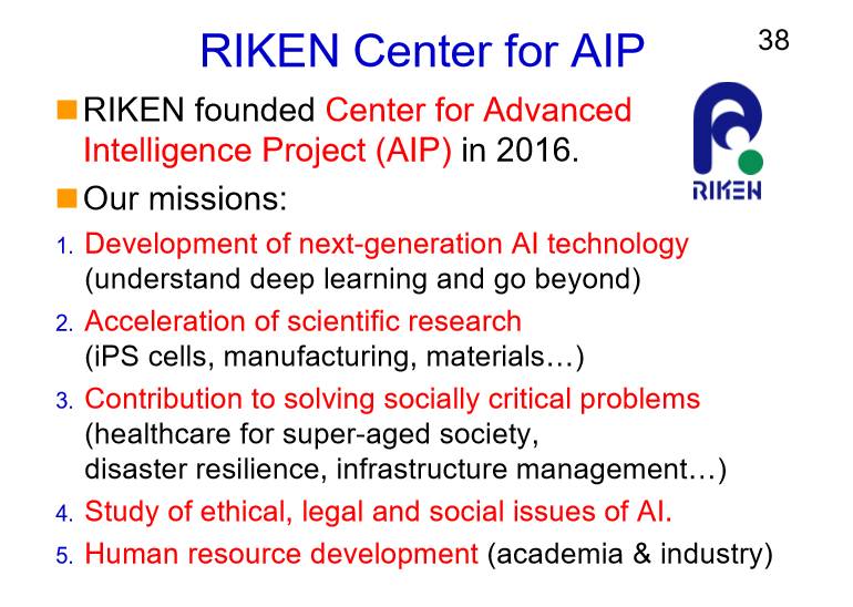 最后介绍一下我所在的研究所,日本理化研究所先进智能研究中心,也就是AIP。我们所关注的更多是先进的、智能的研究项目。在2016年的时候我们就成立了这个研究中心,我们有5个任务,分别是开发下一代的AI技术、加速科学研究、把AI用于决策日本的社会重大的问题,以及研究AI道德、法律和社会问题的问题,还有希望解决人力资源发展。