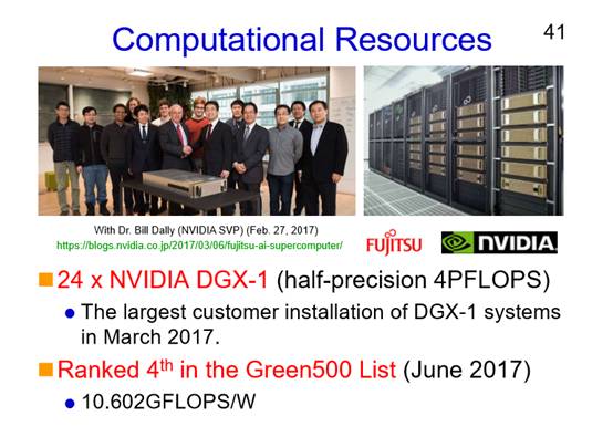 计算资源对于我们来说也非常的重要,我们决定购买了24台NVIDIA DGX-1,我们在Green 500列表上排名第4,我们现在能实现10.602个千兆次的计算能力。我们的办公室在东京,和火车站非常近,东京站走过去就可以看到我们的大楼。我们在大楼的15楼,入口是这样的,在内部我们有一个非常开放的讨论空间,也可以邀请来自学术界、研究机构的客人过来进行讨论。