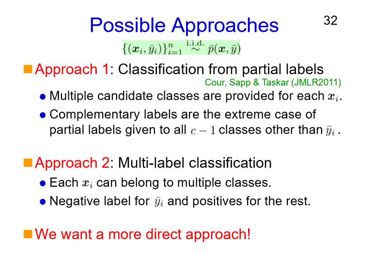 第一种方法,我们使用部分的标签来做分类,我们会有这样的一个多候选类,对于每一个互补标签的话,都会设置一个极端的情况,也就是c,所有的c我们都会给一个互补标签,一直把它从c一直到c-1;第二个办法可能并不是特别正确的办法,我们可以考虑多标签的分类的方法去做。在这个设置当中,每一个样本都会属于多个不同的类,也就是说对于互补类和正类的话我们都会使用的一个负标签,这个办法可能目前来说并不是特别好,但是有可能做的更好,总的来说,我们希望能够用更简单的办法来解决这样一个问题。