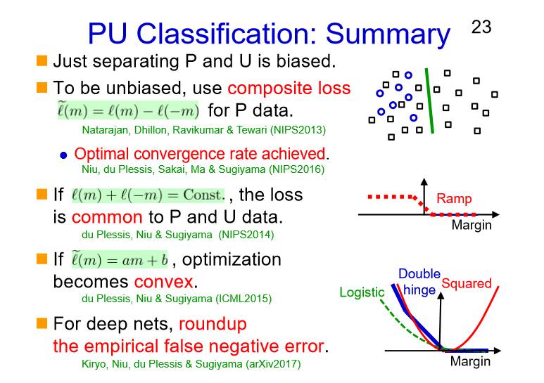 现在我们对于PU分类学习有了解决方案,对NU分类学习也有自己的解决方案,所以PU跟NU基本上一样的。PN是一个标准的方法,我们也有相应的解决方法,对于PU、PN和NU分类学习中能不能使用半监督的方法,我们是希望能把其中的两者结合起来,就是蓝点或黑框或者红叉和黑框结合起来。