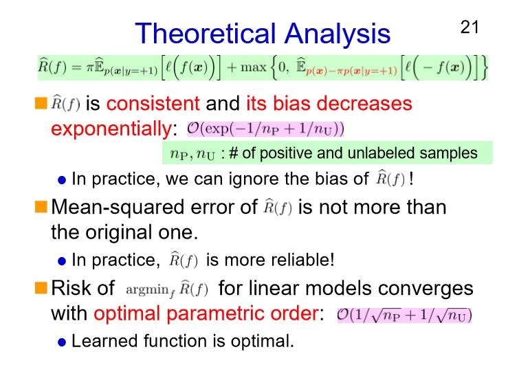 具体的公式转换如下图所示,它背后的理论是正负数据分类风险满足一定的边界条件,具体的细节在这里就不细说了。这是最优的方法,我们可以通过PU的学习,从PU的数据中得出PN的信息。