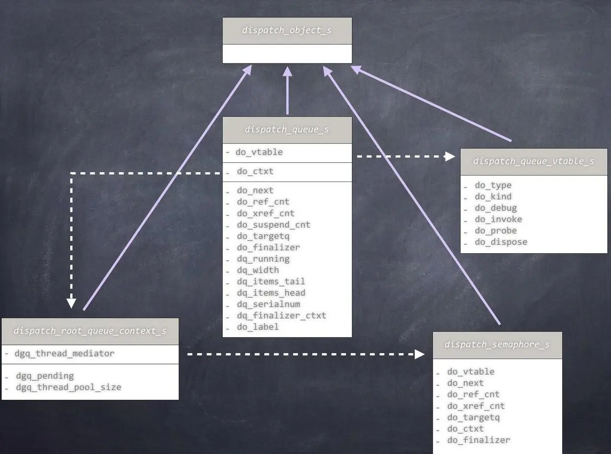 联合体union保证了各变量享用同一个内存地址,这也意味着各变量是互斥的。通过联合体结构,libdispatch实现了类型强制转换的效果。另外,通过宏定义DISPATCH_DECL(name)来保证所有dispatch_xxx_t变量实际上是一个指向 dispatch_xxx_s的指针: