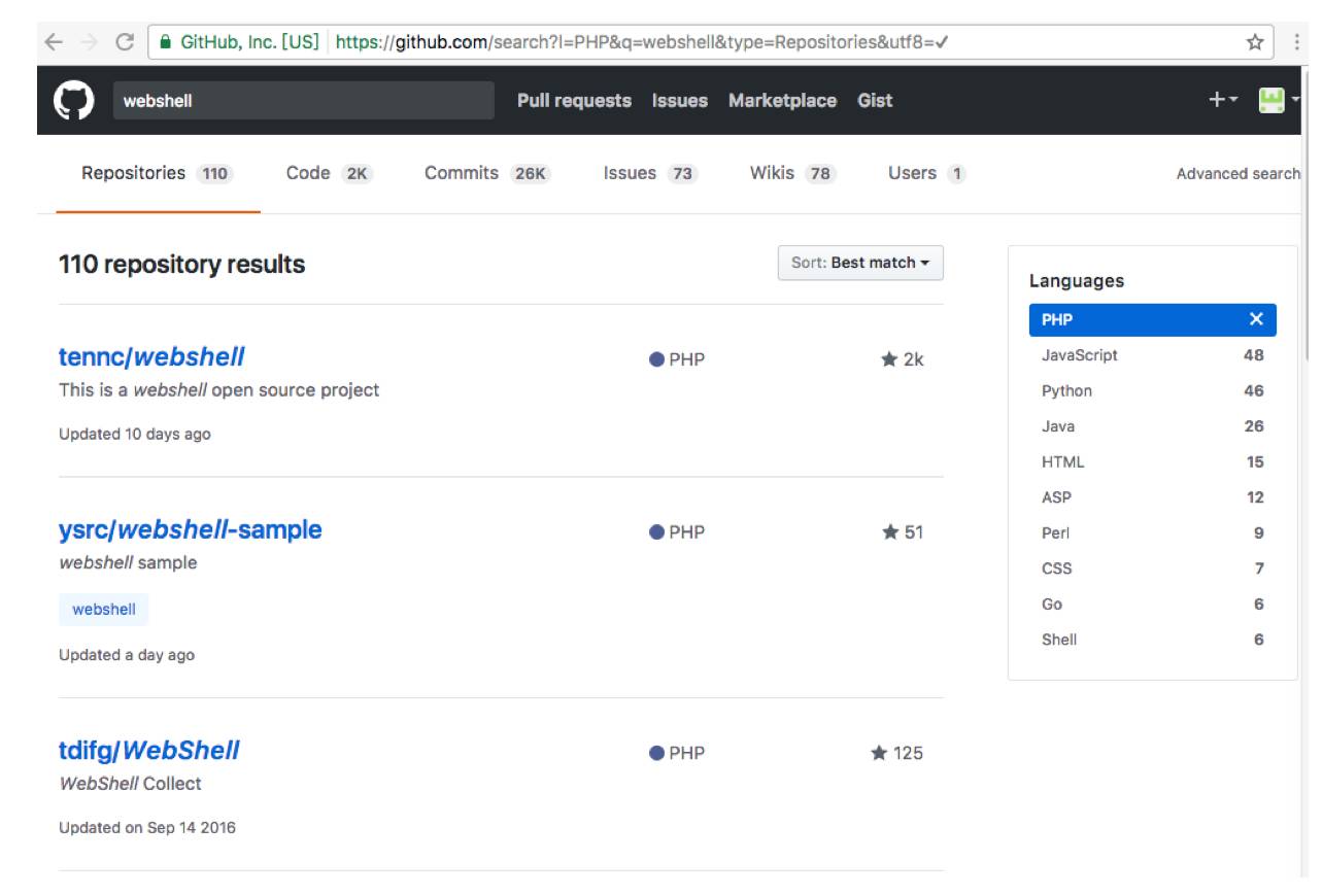 WebShell 数据来自互联网上常见的 WebShell 样本,数据来源来自 github 上相关项目,为了演示方便,全部使用了基于 PHP 的 WebShell 样本。