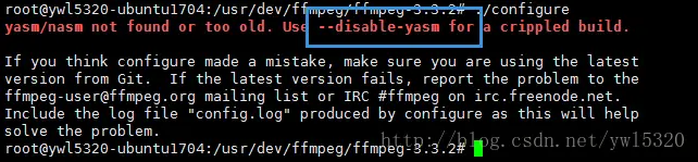 提示我们要用屏蔽yasm才能执行,所以加上参数后的编译命令是: