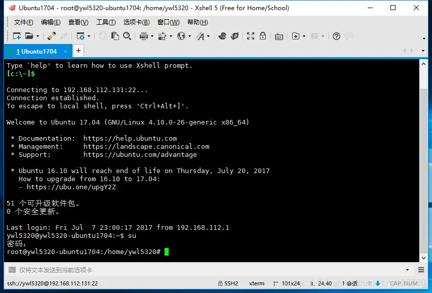 系统启动就可以了,然后用xshell连接到系统中,后面的操作都在在xshell中完成的(附:刚开始搭建xshell连接服务时,还是要进入系统安装相应的软件,百度都能解决,我就是这样的),登录系统并改成root用户: