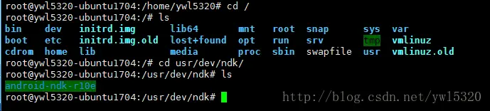在目录:/usr/dev/ndk(根据自己喜好来)中创建ndk目录,并上传下载好的NDK到此目录下,用命令解压:unzip xxx.zip,解压后如下: