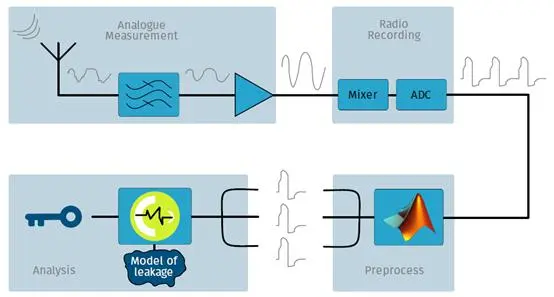 首先使用射频采集设备采集目标芯片的电磁辐射,混频量化后存储到分析计算机中。分析计算机首先对采集的信号进行预处理后,使用上述DPA的方式得出密钥。