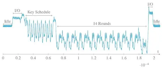 上图就是用上述硬件观测到的AES模式,可以清晰地看到I/O操作之间的AES加密流程,包括Key Schedule过程和14轮的操作,都是清晰可见。
