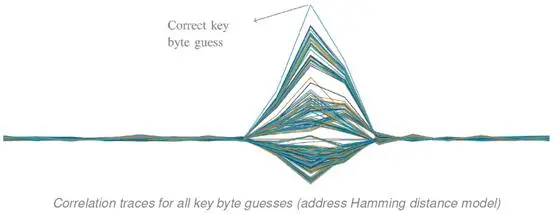 (4)使用相关性分析的方法,比对这256种猜测中,和实际测量值相关性最大的猜测值,就是实际上密钥的第i个字节真实值。