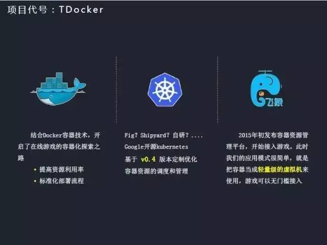 在2015年初的时候,TDocker平台上线。之后,我们开始逐步接入业务。一开始的模式非常简单,就是把Docker当成虚拟机来使用,但这不意味着游戏全容器化的实现。