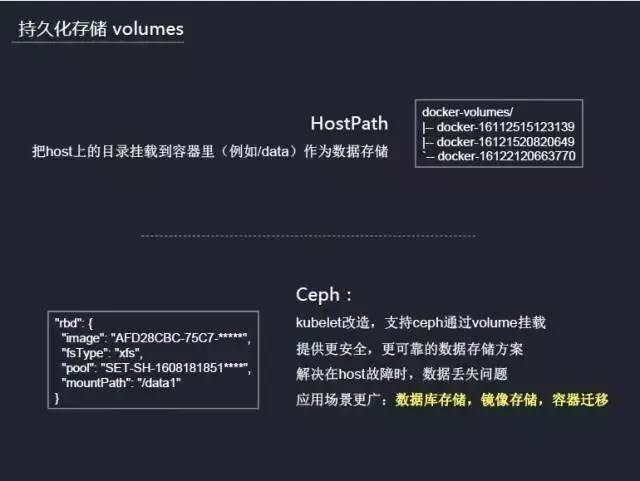 在传统游戏里,更多的是有状态的服务会涉及到数据的存储,我们通过Docker的volume提供持久化存储。最开始我们采用HostPath方式,把host上的目录挂载到容器里(例如/data)作为数据存储。这种做法非常方便、简单,无需额外的支持,但数据的安全性、可靠性方面比较差。所以我们采用了另外一种方案,即Ceph。改造kubenetes支持ceph,通过volume挂载,提供更安全、更可靠的数据存储方案。解决在host故障时,数据丢失的问题,应用场景也变得更加广泛,包括数据库存储,镜像存储,容器迁移等。