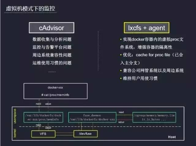我们这里以meminfo内存统计信息为例,为大家讲解如何通过lxcfs用户态文件系统实现Docker容器内的虚拟proc文件系。挂载虚拟proc文件系统到Docker容器,通过Docker的volume功能,将母机上的/var/lib/dockerfs/docker-xxx/proc挂载到Docker容器内部的虚拟proc文件系统目录下/proc/。此时在容器内部/proc/目录下可以看到一些列proc文件,其中包括meminfo。用户在容器内读取/proc/meminfo时,实际上是读取宿主机上的/var/lib/dockerfs/docker-xxx/proc/meminfo挂载到容器内部的meminfo文件。内核VFS将用户请求转发到具体文件系统——fuse,fuse文件系统封装VFS请求,将请求转发给Fuse设备(/dev/fuse)。如果设备上有已经处理完成的请求(例如Cache),文件系统获取处理结果并返回给VFS,VFS再反馈给用户。用户库(fuse daemon)直接访问Fuse设备,读取文件系统转发到设备上的请求,分析请求类型,调用用户接口处理请求,处理完成后将处理结果返回给设备,再由设备返回给VFS,VFS再反馈给用户,从而实现容器内的隔离。公司agent可以通过读取memory等信息,上报到监控平台做分析与报警。同时运维通过SSH登录到这个容器,通过free、top等命令查看性能,维持了运维原来的使用习惯。