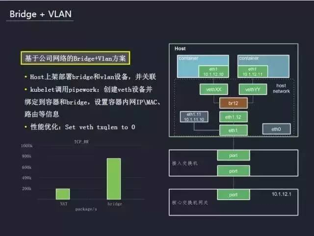 接下来,通过两个方案给大家分析。首先是Bridge+Vlan的方案,母机都是部署在虚拟化区上,通过Vlan做网络的隔离。在母机上架部署时,创建Bridge设备和VLAN设备并将它们进行关联。创建容器的时候,使用pipework脚本创建容器所需要的虚拟网卡设备,并把它们绑定到容器和Bridge上,同时会设置容器内的IP、MAC地址以及路由等信息。从而打通容器到外界的网络通信。这里也做了一些优化以提高性能,这里可以看到一个性能的对比,其中Bridge相对NAT网络有相当大的提升。这种方式可以满足一部分游戏的需求,而有一些业务,像FPS、Moba游戏等大流量,对网络要求非常高的业务,还有类似MySQL-Proxy这种组件,在Bridge场景下是无法满足需求的。