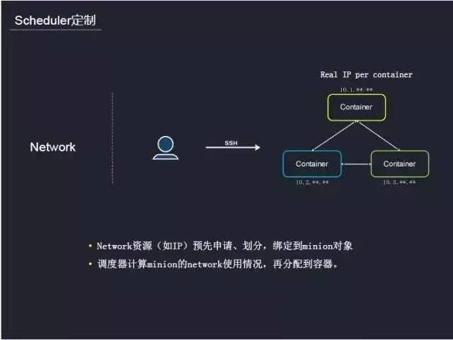 我们在原有的调度策略上根据游戏特点做了一些定制。比如在网络方面,传统游戏的每个容器都需要一个对外可见的实体IP,用户可以通过SSH登录到容器里面,因此对网络资源进行调度。部署容器的时候,会申请network的资源(比如IP)然后进行划分,绑定到minions对象。这样调度器调度的时候,就可以通过这些配置信息给容器分配好网络资源。