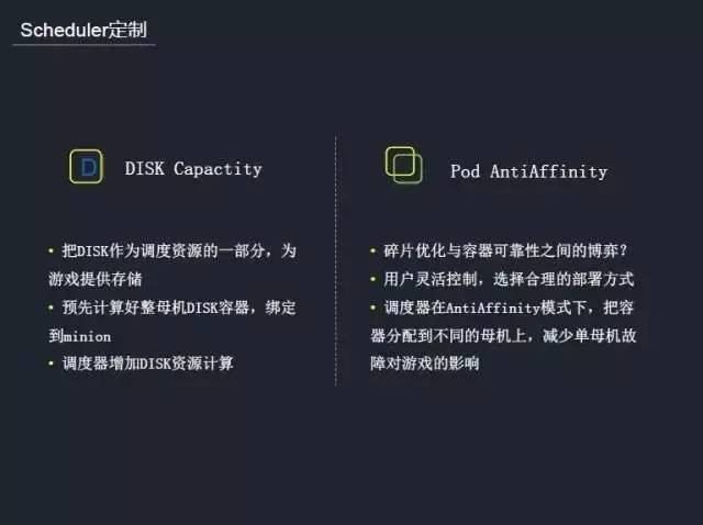 在磁盘容量分配方面,由于游戏业务是有状态的服务,需要存储,所以我们把磁盘也作为一个可调度的资源分配给容器。还有非亲和性的调度。我们知道,在容器的可靠性与碎片优化之间需要一个权衡,让用户根据这些策略去选择、部署自己的容器。例如在非亲和性的策略中,用户希望把容器是分散到各个母机上的,在母机宕机时,可以减少对游戏的影响。