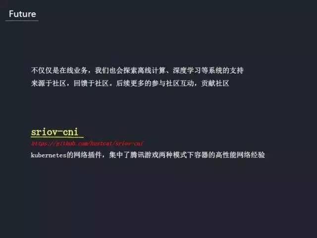 来源于社区,回馈于社区。后续我们还会更多地参与社区互动,为社区做贡献。这也是我们想去做的一点。目前有个开源的项目,sriov kubernetes的网络插件(github.com/hustcat/sri…),集中了腾讯游戏两种模式下容器的高性能网络经验,大家感兴趣的可以关注下。