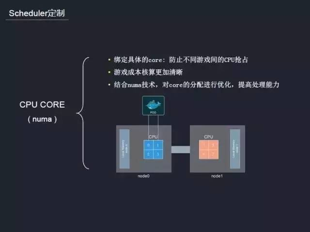 在社区中,CPU的分配用的是共享CPU的方式,游戏采用的是一种混部的模式。也就是说,将不同游戏业务部署到同一台母机,采用绑定核的方式。这样做一方面可以防止不同游戏之间的CPU抢占,另一方面对游戏成本的核算也会更加精细。例如,某个游戏用了多少CPU这些指标都是可以量化的。在容器分配CPU时,结全numa技术,对于CPU CORE的分配会尽量地分配到同一个numa node上,这样可以提升性能,因为同个numa node的CPU访问只需通过自身的local memory,无需通过系统总线。