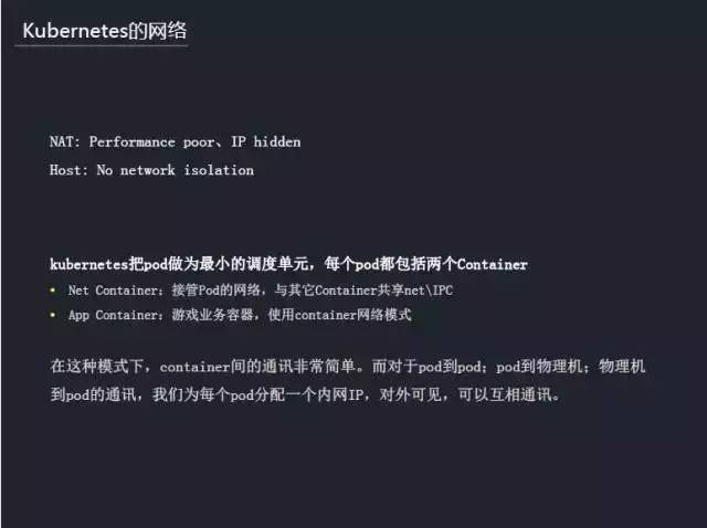 先来说,Docker的网络还有kubernetes的网络。对于Docker的NAT网络来说,性能是最大的瓶颈,同时它与物理机或虚拟机的通信路径不一致也会对业务带来一些未知的影响。比如,外界不能看到容器真实的IP(必须要使用主机IP+port方式,端口本身就是稀缺资源,并且ip+port的方式,无疑增加了复杂度),TGW仍然可以为业务程序服务。Host模式没有隔离,也不符合需求。在kubernetes中,pod作为最小调度单元,每个pod有两个容器,一个就是网络容器,接管pod的网络,提供网络服务,并与其它容器共享net\IPC。另一个是App Container,也就是业务容器,使用第一个网络容器的网络。在这种模式下,容器之间的通讯是非常简单的。对于pod到pod、pod到物理机、物理机到pod的通讯,我们为每个pod分配一个内网IP,对外可见,也可以互相通讯。