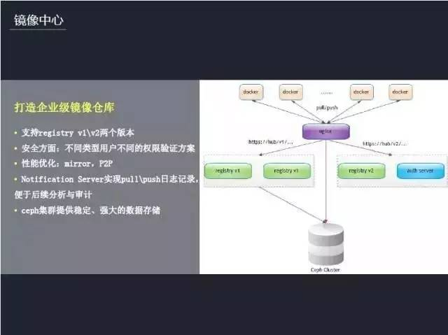 开始讲游戏容器化的时候谈到用镜像来标准化部署,所以我们花了很多时间打造企业级的镜像仓库。目前支持registry v1\v2两个版本,如右图所示,在client端(docker)与registry之间采用nginx作为代理,实现v1\v2不同请求的转发,这样一来,用户无需关心到底请求的是v1还是v2。在安全方面,不同类型用户不同的权限验证方案。公司内部用户接入OA认证,与公司平台打通。外部用户需要申请访问权限,由管理员分配帐号,然后通过分配的帐号来请求。在大批量拉取镜像的时候,镜像中心的性能、效率是我们需要考虑的问题。前期我们通过mirror方案来实现,在主要城市部署mirror registry,通过就近原则来拉取镜像,解决性能瓶颈。后续我们还会采用P2P方案来提升镜像拉取性能。同时我们定制了Notification Server,用于镜像pull\push日志记录,便于后续分析与审计。在镜像后端存储方面,采用ceph集群方案,从而提供稳定、强大的数据存储。