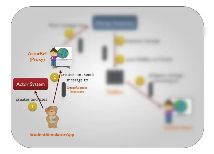 - 通过ActorSystem创建ActorRef,将QuoteRequest消息发送到ActorRef(教师代理)