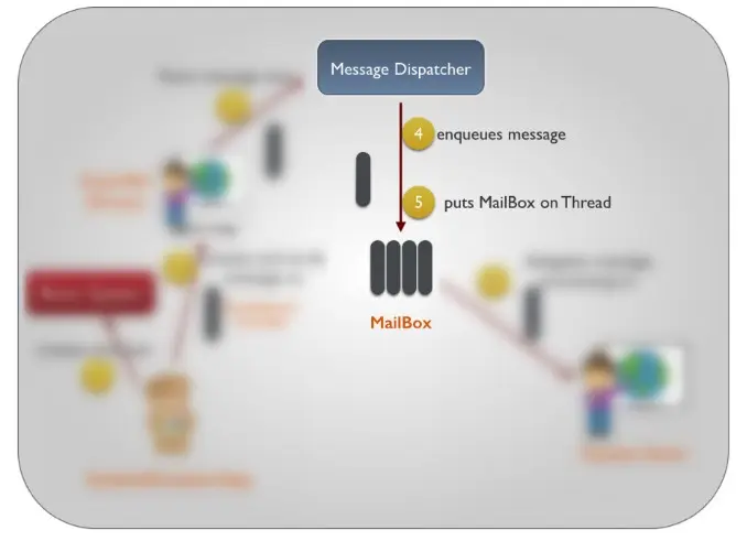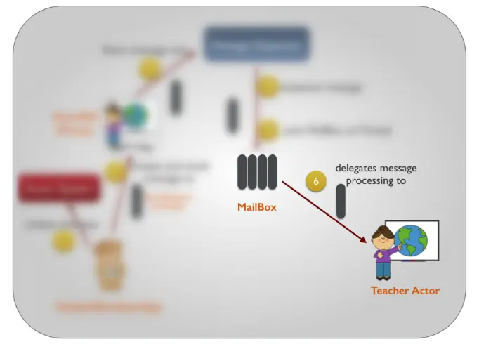 - 每个Actor都有一个MailBox,同样,Teacher也有个MailBox,其会检查MailBox并处理消息。