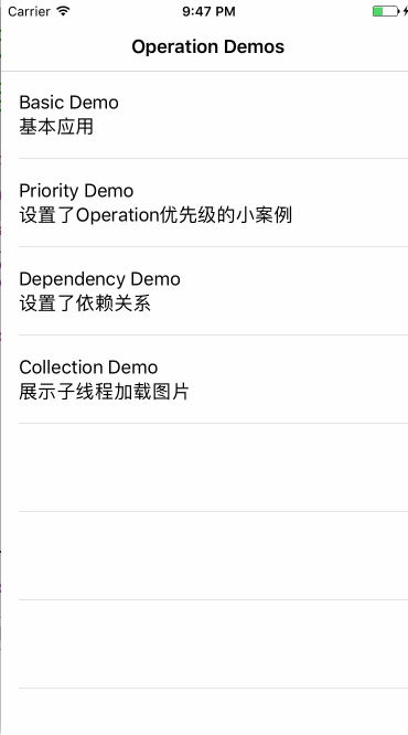 今天的开餐小菜是看看怎么设置一个依赖关系的Demo。然后就是一道相对丰盛的大菜,使用Operation在CollectionView上实现子线程加载图片的案例。这个例子其实在生产中经常可以碰见。先把界面加载出来,然后再慢慢往item里面加载图片。