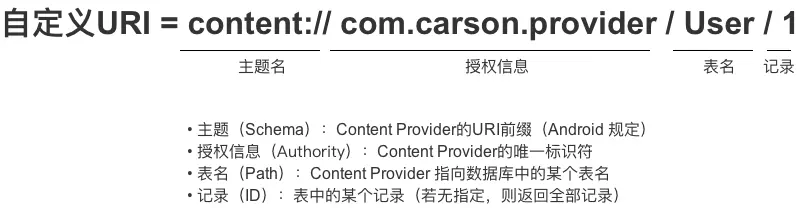 // 上述URI指向的资源是:名为 `com.carson.provider`的`ContentProvider` 中表名 为`User` 中的 `id`为1的数据