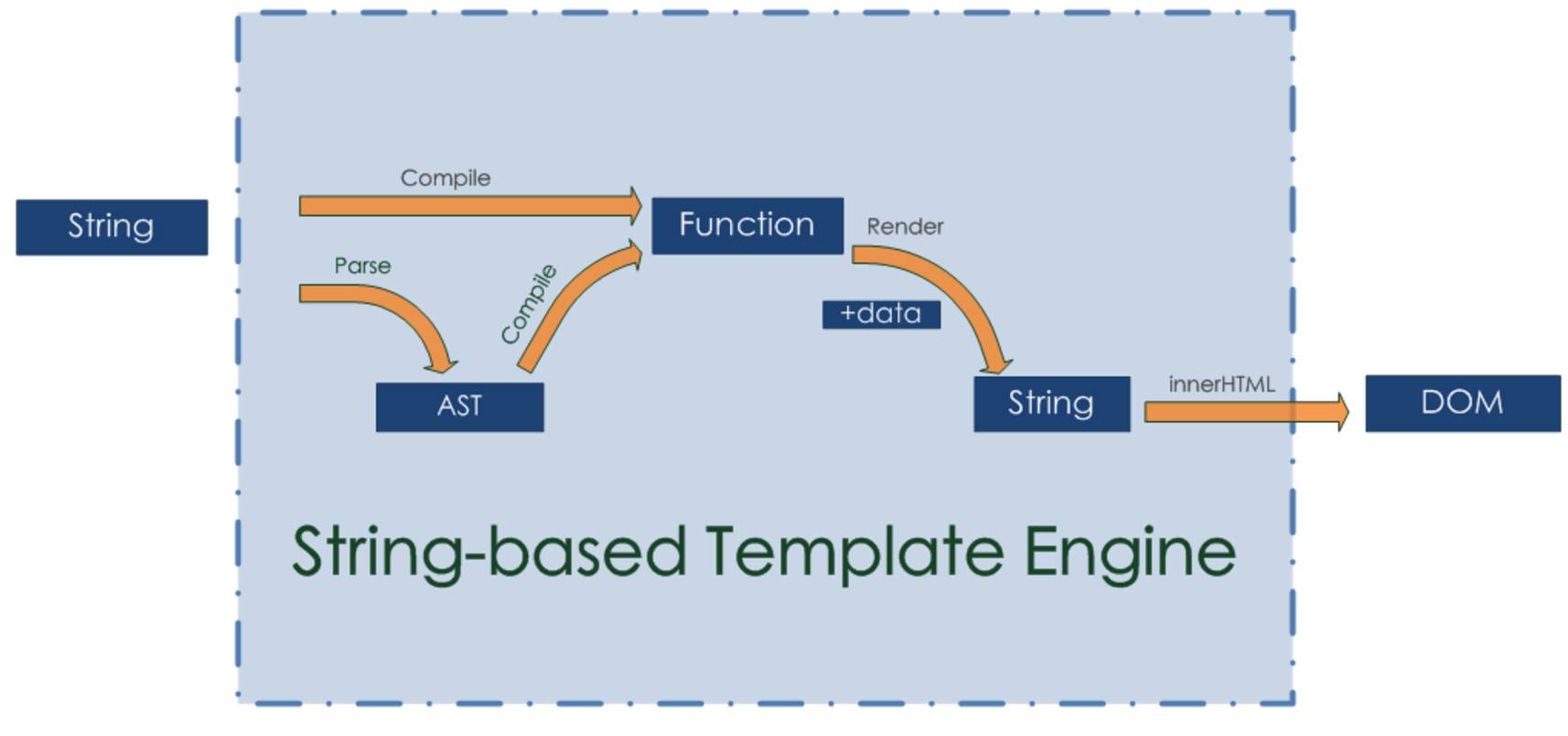 基于字符串的模板引擎,本质上依然是字符串拼接的形式,只是一般的库做了封装和优化,提供了更多方便的语法简化了我们的工作。基本原理如下: