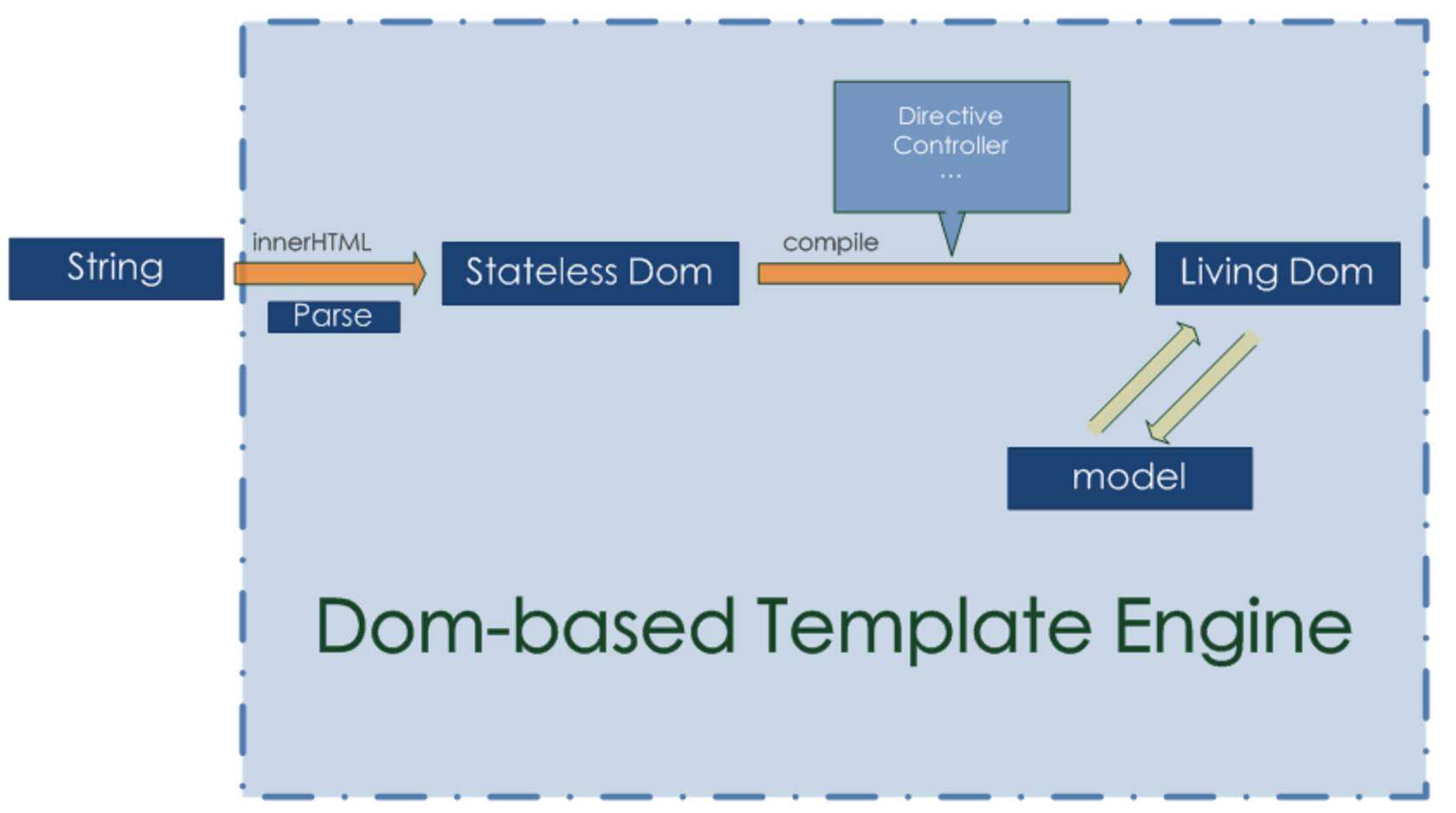 这种实现和我们讲到的 Dom-based templating 类似,只是更加完备,具有自定义指令的功能。