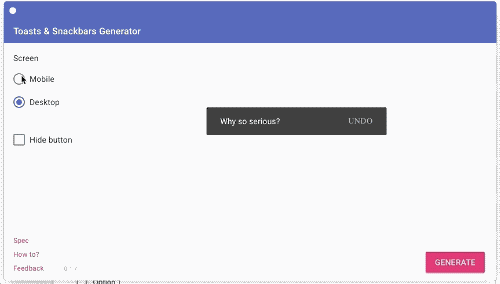 Material Design 中关于 Snackbar 的描述[Snackbars & toasts - Components - Material design guidelines] (https://material.io/guidelines/components/snackbars-toasts.html)