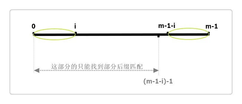 对于代码if (suff[i] == i + 1),如上图,两个椭圆的长度都是i + 1,其所表示的字符都对应相等。正如下面浅黑色字所述,若有if (suff[i] == i + 1),因为下标 0 前面没有字符,故 0 到 (m-1-i)-1 这部分的都只能找到部分匹配。