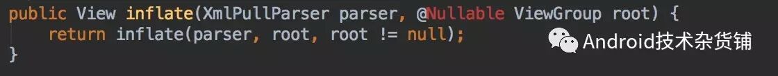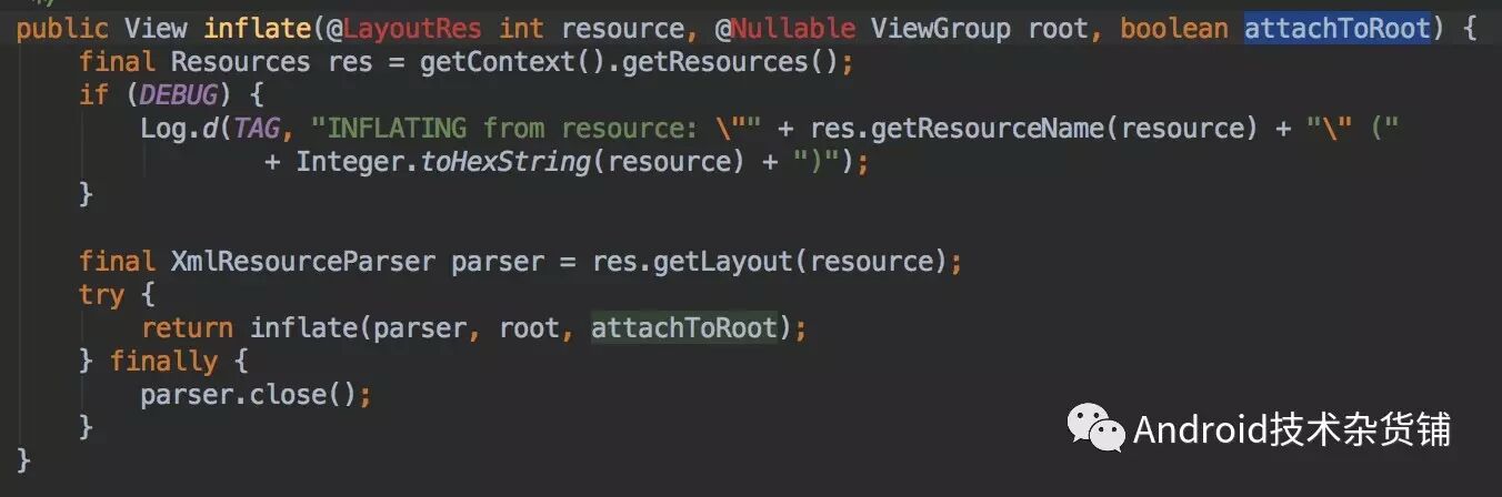 因此,我们一般只调用接收布局文件ID的inflate方法。两个重载方法的区别在于有无第三个参数attachToRoot, 而从源码里里面可以看到,两个参数的方法最终调用的是三个参数的inflate方法: