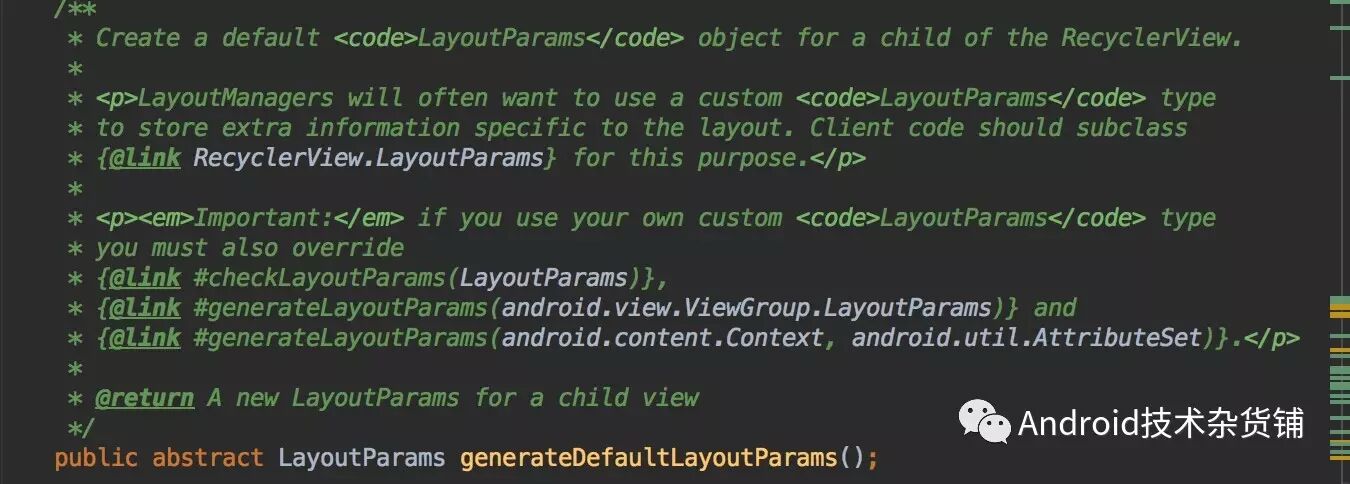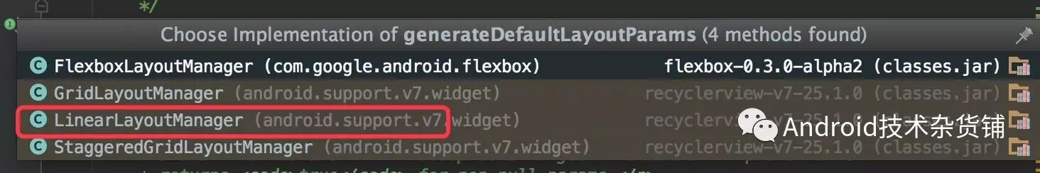 可以看到generateDefaultLayoutParams是一个抽象方法,具体的实现由对应的LayoutManager实现,我们用的是LinearLayoutManager,因此我们看一下LinearLayoutManager 的实现。